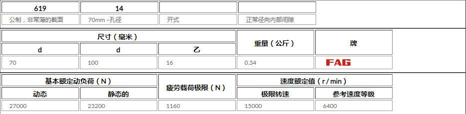 توضیحات محصول 619 14 متریک ، بخش بسیار نازک 70 میلی متر - اندازه مته سوراخ اندازه ابعاد ترمیمی داخلی شعاعی داخلی (میلی متر) وزن (کیلوگرم) نام تجاری d DB 70 100 16 0.34 امتیاز بار دینامیکی پایه (N) حد مجاز خستگی (N) رتبه های سرعت ( r / min) دینامیک سرعت محدود کننده سرعت امتیاز مرجع امتیاز سرعت 27000 23200 1160 15000 6400